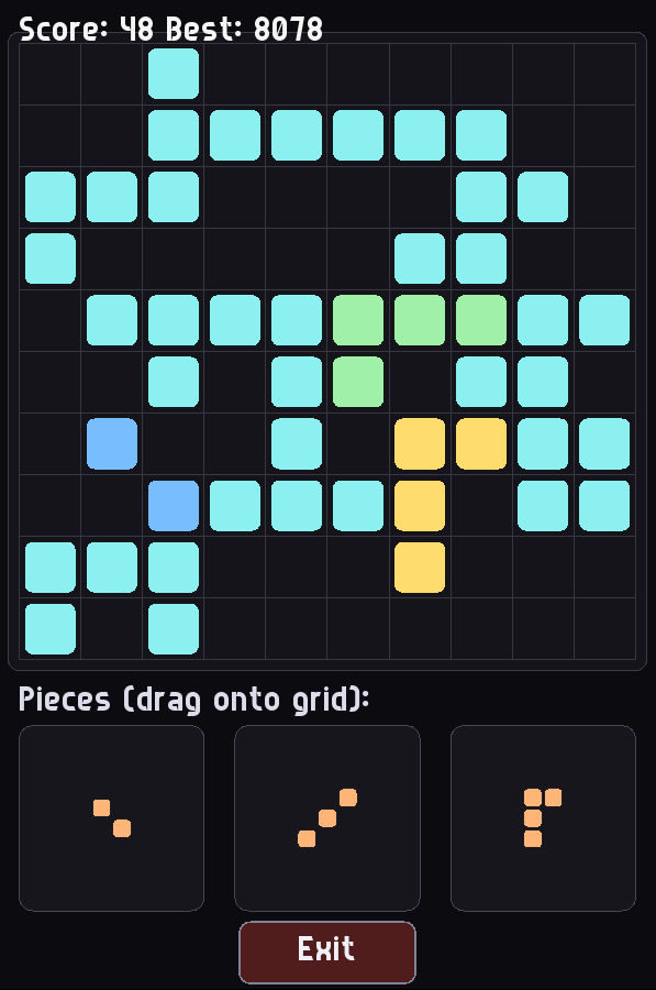 A fast-paced block-placement puzzle game inspired by Block Blast. Drag and drop pieces onto the grid to clear rows and columns, simple to learn, endlessly satisfying to master.